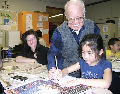 SCHOOL創辦已有三十年,他們辦學的宗旨是弘揚中華傳統文化,同時爲中西方文化交流架橋樑。現有110個學生,來自72戶家庭。學校每年都舉辦多次大型活動,有慶祝中國新年,中文和藝術比賽,室外暑假宿營活動,今年學校將搞一個圖書展覽會,將聯合鄰近的圖書館一起合作舉辦。圖爲今年88歲的書法老師馬國均老先生在敎學生寫毛筆字。 |