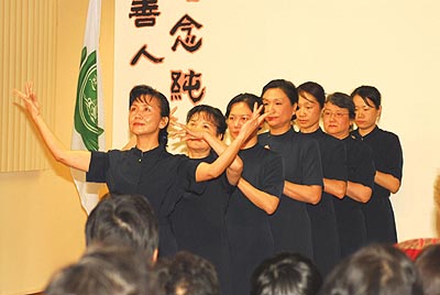 「慈濟大藏經」播放著在世界各個角落的慈濟人,每天用不同方式在行經,聞聲救苦的無所求付出,為現場帶來相當的震撼和感動,志工們也適時地遞上紙巾。緊接著由委員和陪訓師姊呈現的“千手世界”音樂手語後,濟陽師兄說說其實慈濟世界就是一個千手世界,他鼓勵大家走入慈濟世界裡,做菩薩的一隻手、一隻眼,發揮千手千眼的力量,也期盼大家能化身千手裡,因為善會讓生命美麗,因為感恩而讓生命歡喜。