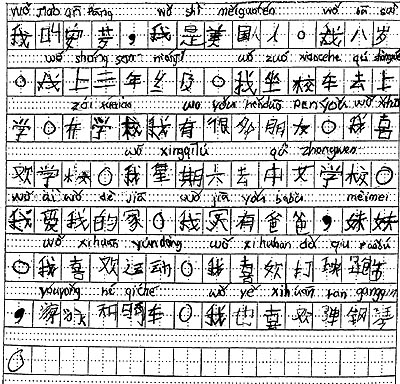 她和她的父母總是犧牲星期六早上的懶覺。幾年過去,她已能用漢字寫句子了。