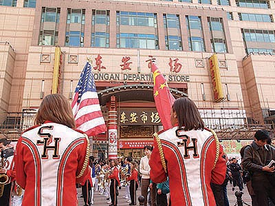 在北京百貨大樓門前的廣場上交錯的站立着兩校的學生。雖然大部分的美國流行歌曲中國的學生並不很熟悉,而且從來沒有合奏過,但是他們憑藉紮實的功底和優秀的指揮,給所有人呈現了一篇和諧的樂章!値得一提的是,金帆樂隊的指揮同樣也是天安門廣場上昇旗儀式的指揮,當天是周日,他便是剛剛卸下軍裝來參加這次活動的!當天漢辦的老師領導也來到了演出的現場!