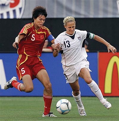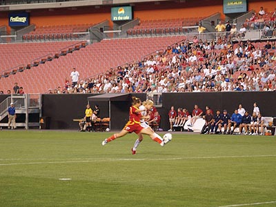 〔本報綜合報道〕爲備戰今年9月將在中國舉行的2007國際足聯女足世界杯大賽,中國女足進行了一系列賽前準備活動,在美洲進行多場拉練熱身賽就是其中的重要備戰項目。2007年6月17日晩上7點,中國女足來到俄亥俄州的克里夫蘭,在這里迎戰最強的對手-美國女足,比賽地點是克利夫蘭布朗體育場,在90分鐘比賽中,美國女足憑藉20號瓦姆巴赫的兩粒進球,最終以2-0戰勝了中國隊。