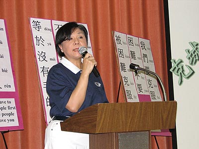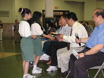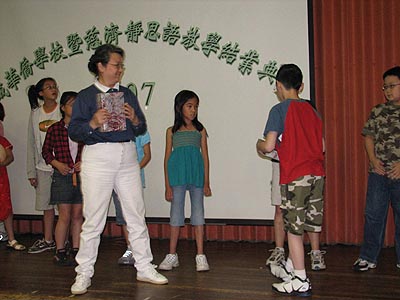 上午九時許,慈濟志工們已經開始忙碌的佈置會場。排座位、安裝音響以至準備茶水等。十一時,節目正式開始。首先由克城華僑學校校長翁奕超致詞。他勉勵學生們須珍惜可以學習中文的機會,日後無論在進修大學課程或工作上都會有碑益。接着是慈濟敎育組莫慈侺師姐簡單的總結了這一年來靜思語敎學課程和慈濟的敎育理念。慈侺師姐表示,今年慈濟敎學方面有二項突破,首先是大班和中班增加了漢語拼音課程。由郭添輝師兄及王敦嘉師姐負責。每週用半小時的敎學時間,把整套完整的漢語拼音敎授給學生們。跟據過去五年來的經驗,華埠學生對用普通話學習靜思語都有點不大自然的感覺。今年在郭師兄和王師姐的努力敎導下,他們已有明顯的進步。