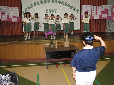 今天第一個學生表演的項目是「奉茶」。由田慈述師姐帶着低班學生向部份來參加結業典禮的家長及來賓奉茶。只見九位年幼的學生分成左右兩排,在寧靜典雅的古箏音樂下,亦恭亦敬的緩步走至他們的父母親面前,深躹躬後雙手奉上茶盤。小孩子的表現,令在場的觀眾都為之動容。其中的一位父親,在接過兒子奉上的香茗後,感動到流下淚來。