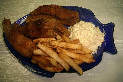 dinner was ready, hot and crisp. Moist, mild-tasting pearly flakes