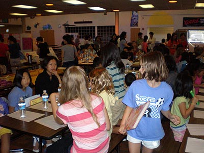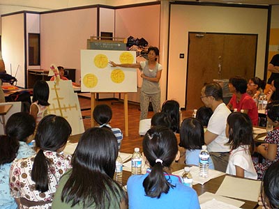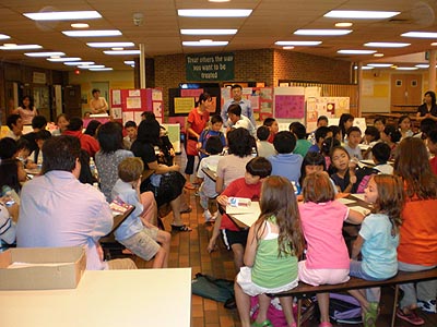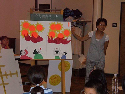 這次聚會除了品嚐月餅,幾個班的學生們還精心準備了節目,形象地介紹了中秋節文化。《嫦娥奔月》的故事雖然家喩戶曉,但民間傳説也有不同的版本。簡字三班的學生人數最多,在老師王宏的指導下,學生們採用集體“輪述”的方式,用中文給各位來賓講訴了“蓬蒙偷藥”版。而成人二班的學生們,以精美的連環畫挂圖,用英文演繹了“後弈虐政”版,老師童興駖女士擔任中文口譯。國字四班的大學生們不甘落後,中英文相佐,表演了三個故事。其中名相劉伯韞與月餅的典故,吿訴大家蛋黃餡的寓意。講述《吳剛折桂》時,一個小朋友充當“百折不撓”的桂樹,陳守平老師以敎鞭做斧,模仿吳剛費力砍樹,逗得觀衆前仰後合。《玉兔搗藥》讓大家浮想聯翩,並爲兔子的獻身精神而感動。楊賽妮老師的成人一班都是今年加入西湖學校的新學生,他們以勤補拙,努力用漢語演出了群口相聲《吃月餅》,大大方方地逗哏、捧哏,觀衆報以熱烈掌聲,旣感謝他們爲大家帶來了歡樂,也爲他們的刻苦精神所感動。