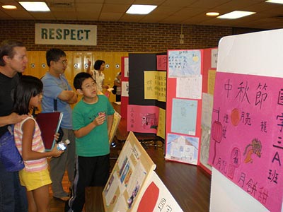 本次聚會上,還展出了各班學生爲中秋節趕制的展板,大家各盡其能,寫字能力強的學生認眞抄了李商隱的《嫦娥》和李白的《靜夜思》;動手能力強的學生用美術字在彩紙上貼出了“祝爸爸、媽媽節日快樂!”;愛繪畫的學生給大家展示了栩栩如生的月餅,飄逸多姿的嫦娥……拙樸的筆迹、童趣的圖片無不透出學生們的細心、耐心和精心。