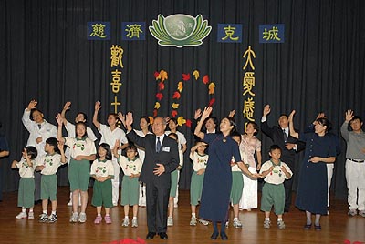 接著,參與活動演出的小菩薩、志工及師兄姐們,依序上台手拉手,在大愛讓世界亮起來的曲目中,共同感恩所有大德十年來的護持。如同歌詞所述:「心是世界的地圖,愛不分日落日出,藍天白雲從不孤獨…」;慈濟志業的發展,不僅是個人或一小群人的努力,而是十方大德的善念與善行的匯聚。