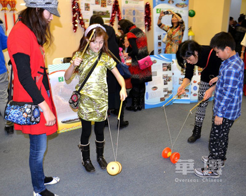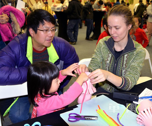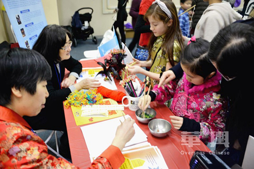 當天整個“餃子宴”活動分布在三個展廳內舉行,除了最受歡迎的敎授包餃子和彩色餃子展示外,還有中國算盤、折紙、做燈籠、剪“春”字、書寫漢字、抖空竹、踢毽子、書展等豐富多彩的近30個攤位。在餃子宴舉辦期間,還穿揷有古箏演示演奏、旗袍服裝秀、茶藝展示和茶具展覽、彩虹字謎和抽奬等多種文化娛樂項目。陳健説,我們的“餃子宴”
