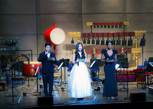 音樂會在觀衆的熱烈掌聲中拉開帷幕。矗立在舞臺中央的編鍾奏響了穿透2400年歷史的美妙音樂。整場音樂會以“八音和鳴”的形式精心挑選曲目。曲目中旣有反映遠古時期先民們精神世界的《玄鳥》,又有反映荆楚地域文化特色的《荆楚小調》,旣有反映中國少數民族風情的《瑤族舞曲》,又有反映異域風情的《可愛的玫瑰花》。爲此次音樂會特別準備的美國名曲《蘇珊娜》、《友誼天長地久》,更是將音樂會氣氛推向高潮,觀衆掌聲一陣高過一陣,臉上洋溢着會心的笑容。音樂會結束時,觀衆掌聲經久不息。加演返場曲目,觀衆仍然意猶未盡。